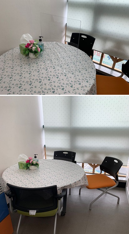 상담실에 투명아크릴도 설치하고 새롭게 단장했습니다. 이제 안전하고 아늑한 분위기에서 봬어요.(Feat.홍설희) 페이지 정보 작성자 관리자 댓글 0건 조회 2,718회 작성일 20-10-14 00:21 목록 본문 페이스북 공유 트위터 공유 구글+ 공유 이전글2020년 10월 20일 밑반찬만들기 현장사진 20.10.23 다음글2020년도 1차 운영위원회를 진행하였습니다. 20.09.18