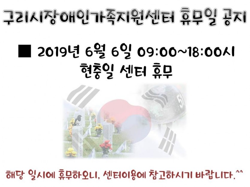 센터 휴무일 공지(6/6) 페이지 정보 작성자 관리자 댓글 0건 조회 8,501회 작성일 19-06-03 00:18 목록 본문 페이스북 공유 트위터 공유 구글+ 공유 6/7 09시에 업무 시작합니다. 이전글7월 센터일정표 19.07.01 다음글6월 센터일정표 19.06.03 댓글 0 댓글목록 등록된 댓글이 없습니다.