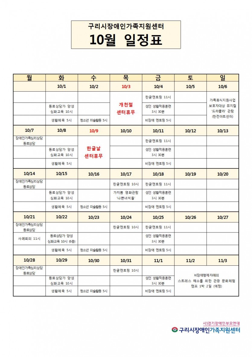 10월 센터 일정표 페이지 정보 작성자 관리자 댓글 0건 조회 9,298회 작성일 19-09-27 00:18 목록 본문 페이스북 공유 트위터 공유 구글+ 공유 10월 센터 일정표 입니다. 많은 관심과 참여부탁드립니다.^^ 이전글센터 휴무일 공지(10/3, 9) 19.09.27 다음글센터 휴무일 공지(9/12~13) 19.09.10 댓글 0 댓글목록 등록된 댓글이 없습니다.