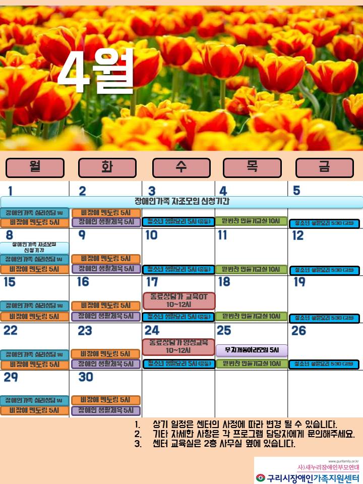 4월 센터일정표 페이지 정보 작성자 관리자 댓글 0건 조회 7,599회 작성일 19-04-02 00:18 목록 본문 페이스북 공유 트위터 공유 구글+ 공유 이전글(모집완료) 장애가족 자조모임 지원사업 참여자 모집(4/1~4/8) 19.04.09 다음글(모집완료) 장애인 생활체육 프로그램 참여자 모집 19.03.21 댓글 0 댓글목록 등록된 댓글이 없습니다.