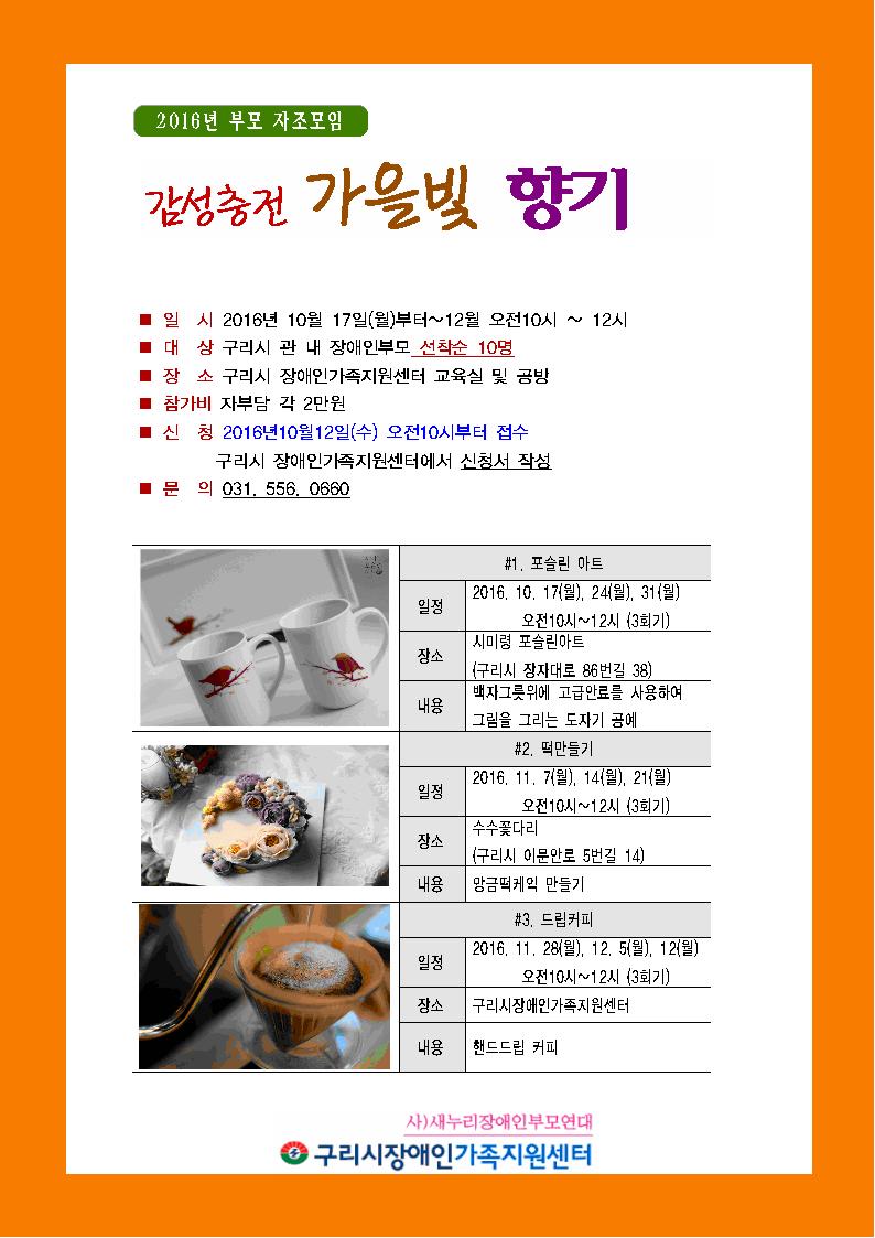 2016년 부모 자조모임 감성충전 가을빛 향기 (사진 첨부) 페이지 정보 작성자 김용기 댓글 0건 조회 9,212회 작성일 16-10-11 00:18 목록 본문 페이스북 공유 트위터 공유 구글+ 공유 이전글발달장애인 자립생활준비 체험홈 프로그램 모집안내 16.12.09 다음글발달장애부모 힐링 백일장 어머니, 나르샤 공고 16.09.28 댓글 0 댓글목록 등록된 댓글이 없습니다.